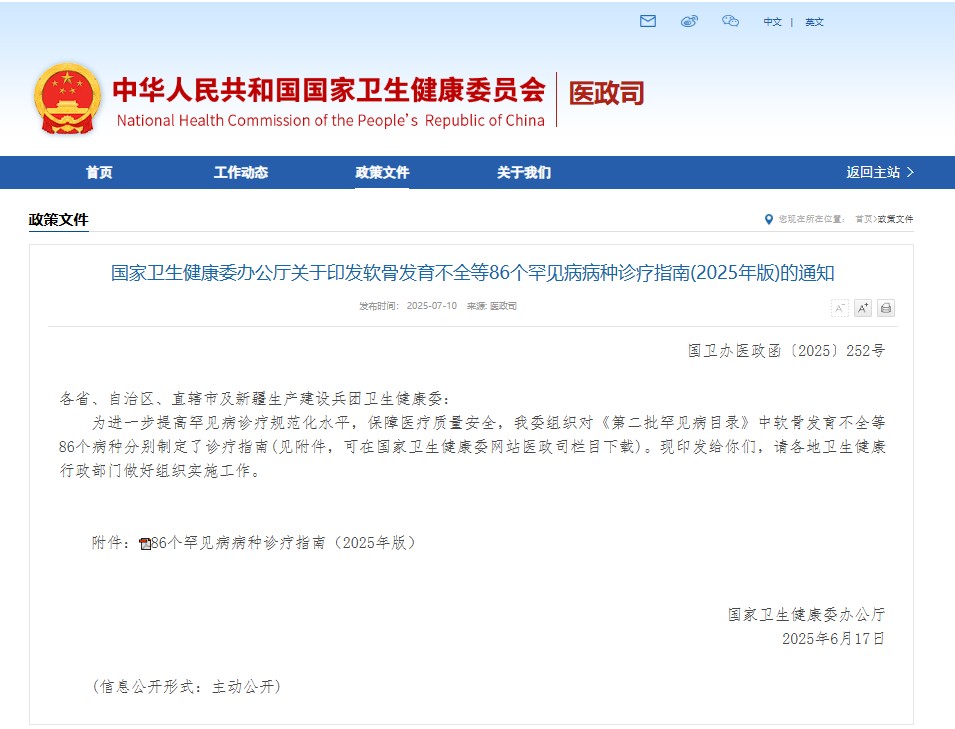 转载自:国家卫生健康委办公厅.国家卫生健康委办公厅关于印发软骨发育不全等86个罕见病病种诊疗指南(2025年版)的通知.https://www.nhc.gov.cn/yzygj/c100068/202507/5b3f41180a42465eb9eec34597bacaf2.shtml?sessionid=-207432835